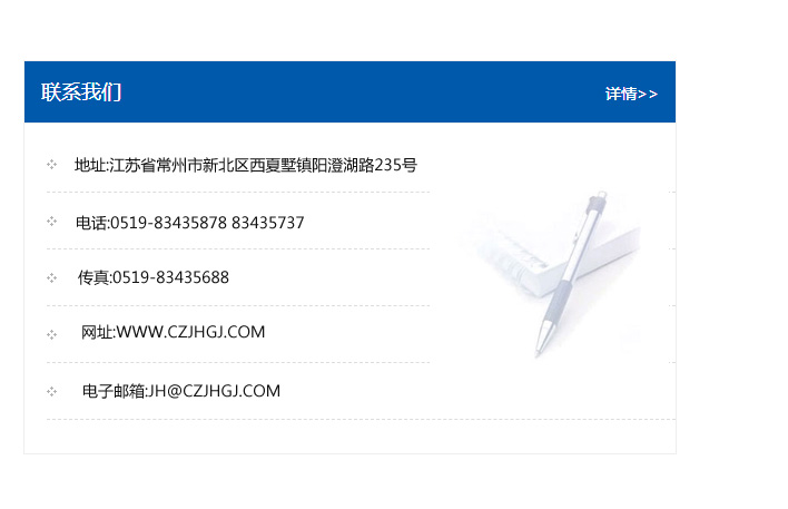 地址:常州市新北區友邦商務大廈1幢16、17層  電話:0519-85101652  傳真:0519-85112595  郵編:213022  網址:www_cz-jiayue_cn.sh8yfck.com  郵箱:xiajifengaa@163.com